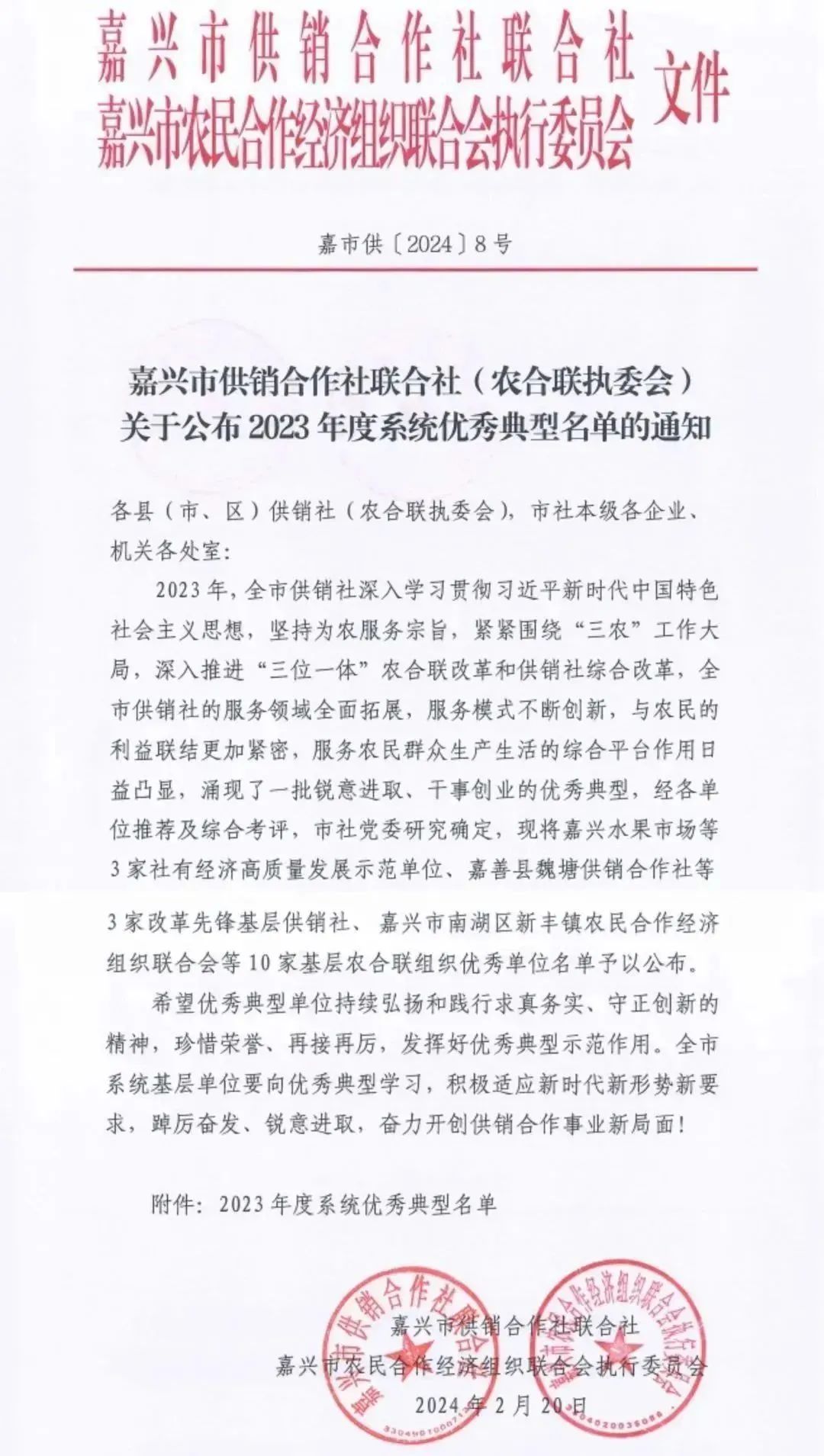 新埭镇农合联以“三位一体”(生产合作为基础、供销合作为带动、信用合作为支撑)农村新型合作体系,创新服务“三农”,打造新型为农服务综合“合作平台”。近日,新埭镇农合联被嘉兴市供销合作社联合社(嘉兴市农民合作经济组织联合会)评为嘉兴市基层农合联组织优秀单位。