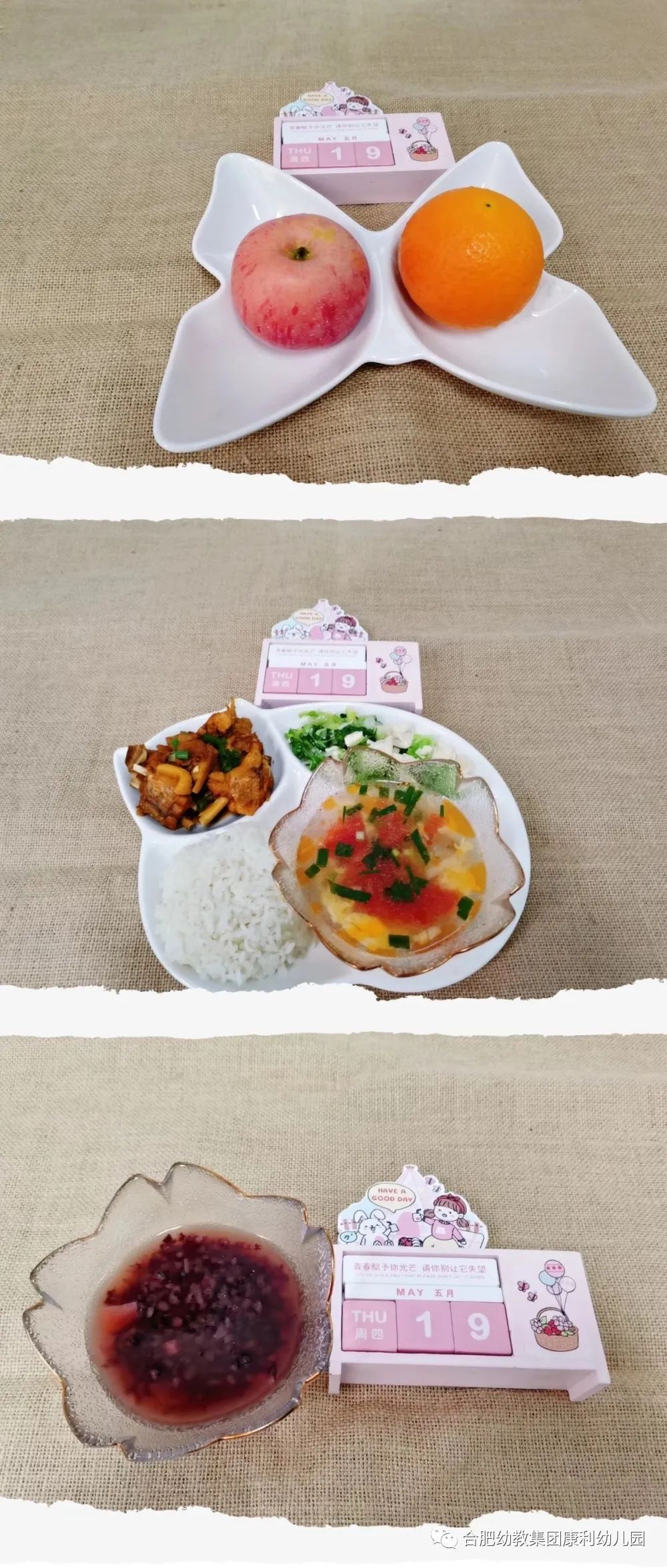 午餐:玉米糁米饭、米粉蒸肉、素炒三鲜(生瓜、胡萝卜、木耳)、番茄金针菇蛋花汤