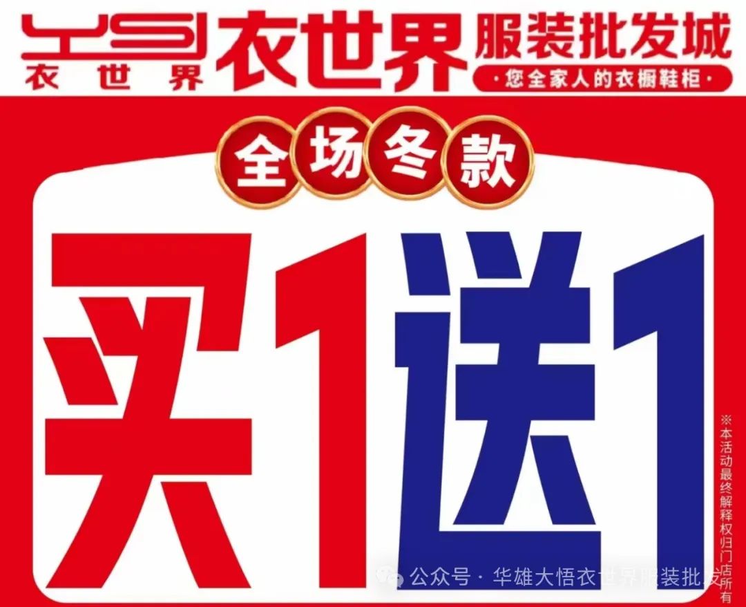 好消息!好消息!“衣世界” 季末清仓大甩卖 全场 冬款 买一送一!买一送一! 实实在在的优惠,实实在在的实惠,心动不如行动,您还在等什么呢?快快来抢购吧!