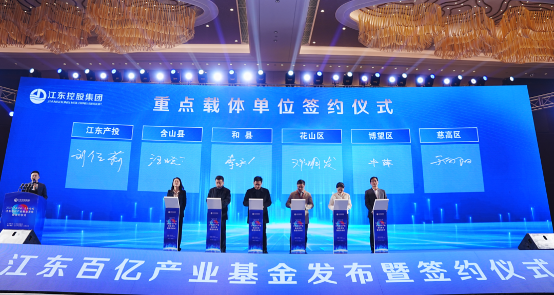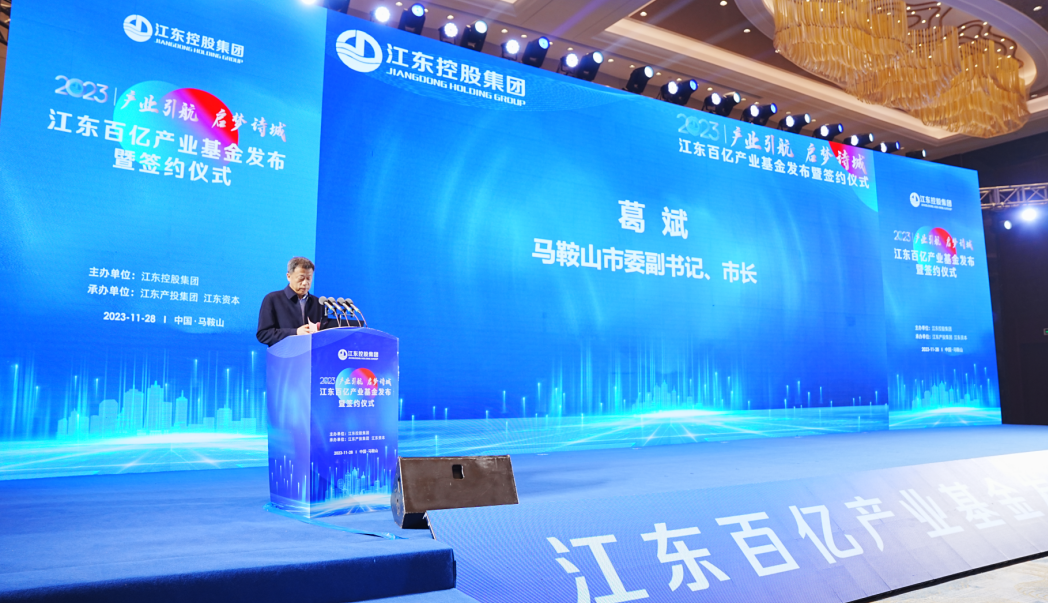 会上,马鞍山市委副书记、市长葛斌,安徽工业大学党委副书记、校长魏先文,马鞍山市委常委、常务副市长黄化锋,马鞍山市政府党组成员、秘书长汪强,江东控股集团党委书记、董事长张邦彦,江东控股集团党委副书记、总经理曹明云共同登台,正式发布江东百亿产业基金,为推动马鞍山产业发展注入“源头活水”。