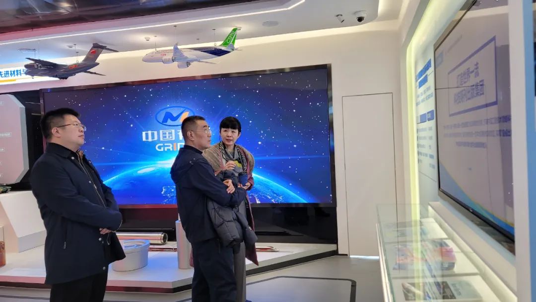 王明革一行参观了中国有研展室。有科出版副总经理马雯、首席技术总监李海亮,北京云算海数科技有限公司董事长许杰陪同。