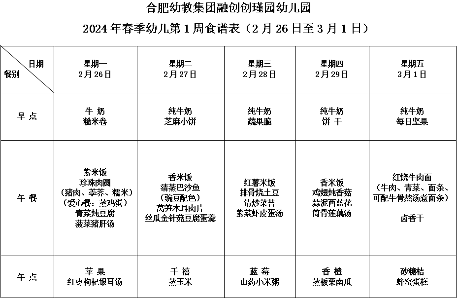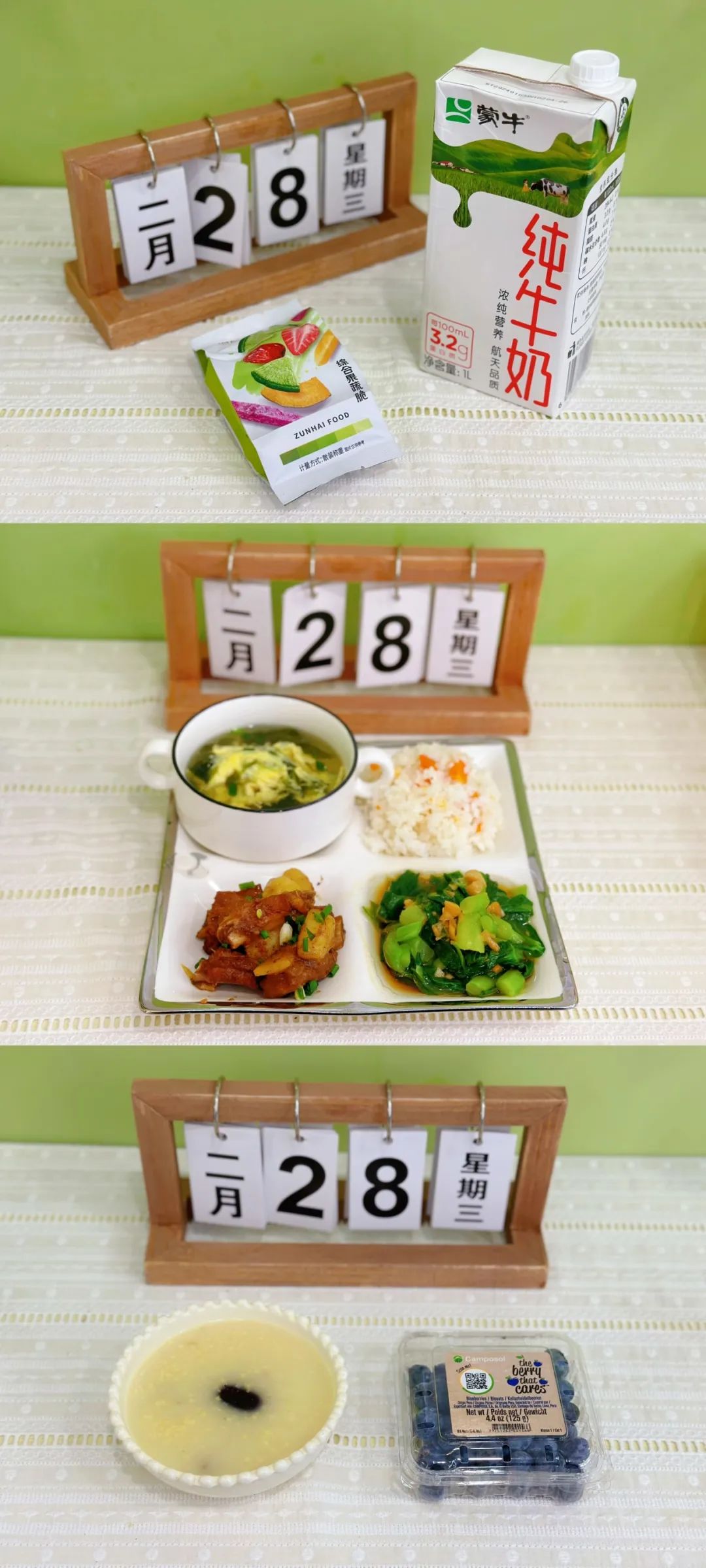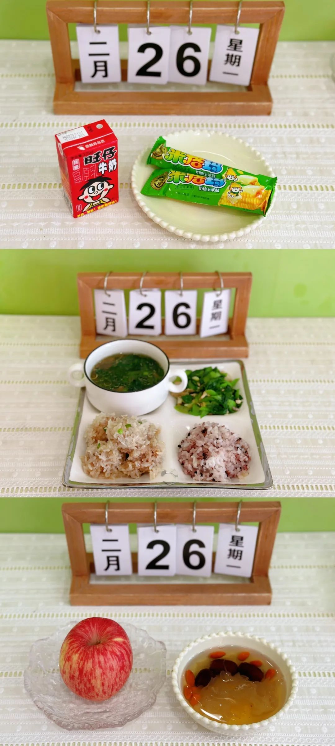紫米饭、珍珠肉圆(爱心餐:蒸鸡蛋)、青菜炖豆腐、菠菜猪肝汤