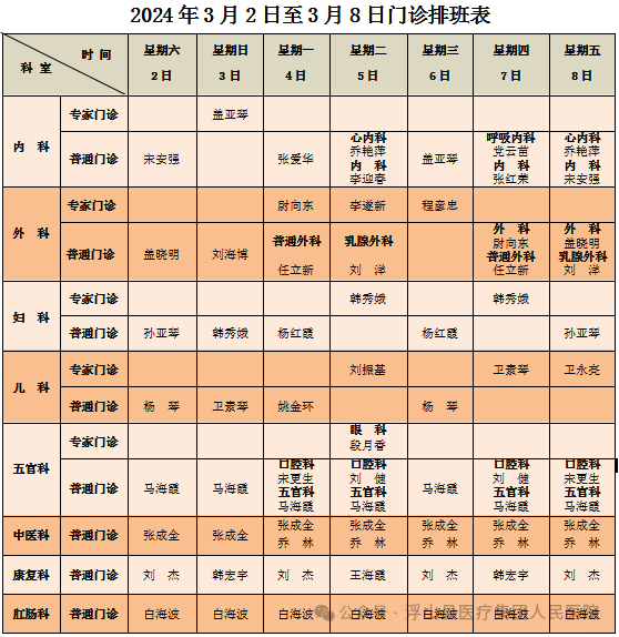 为了更好地方便广大患者朋友们,现将浮山县医疗集团人民医院3月2日——3月8日门诊坐诊医生排班表告知大家。