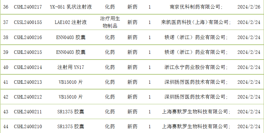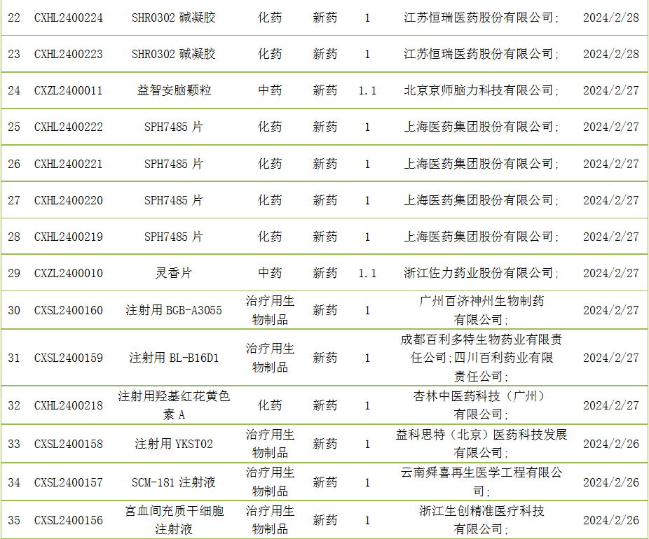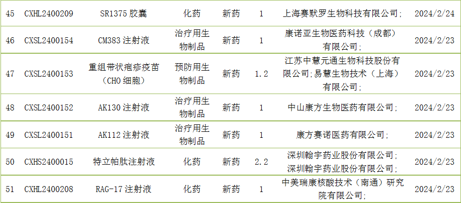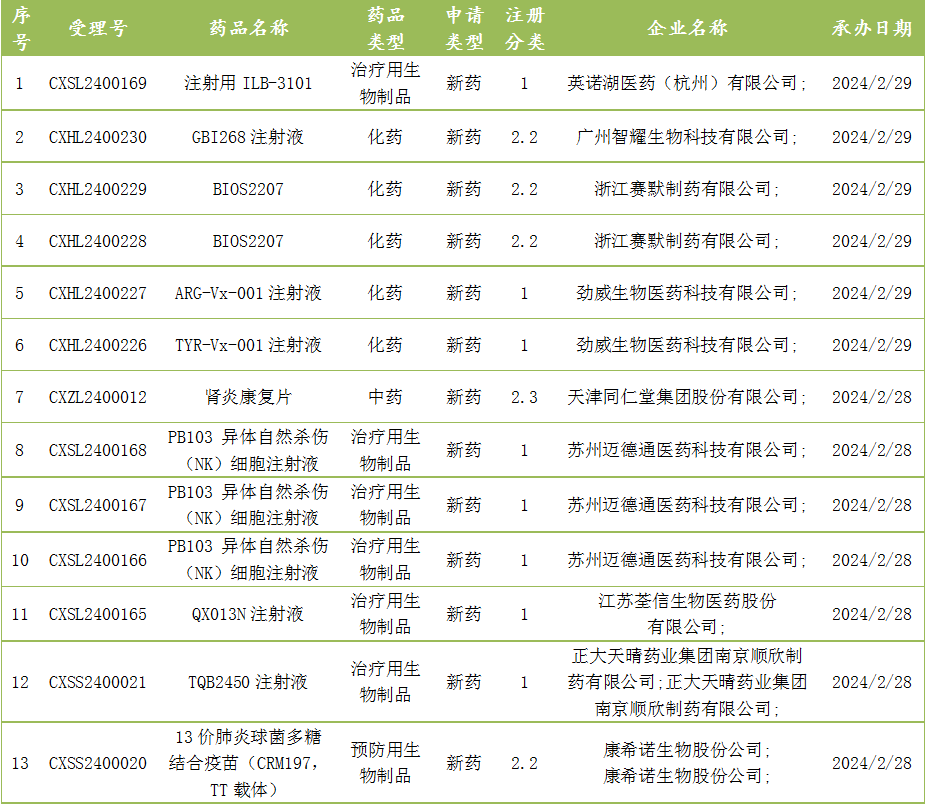 截至2月29日,CDE承办国产新药受理号51个,包括注射用ILB-3101注射液等。