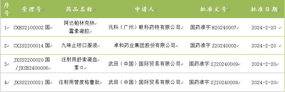 截至2月29日,国家药监局发布3期药品批准证明文件送达信息,其中阿达帕林克林霉素凝胶的新药上市申请获批准。