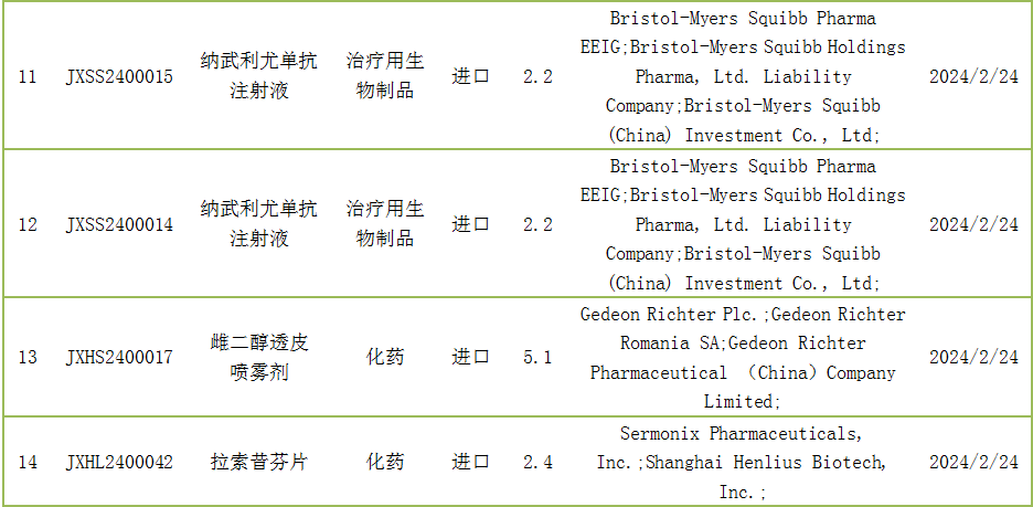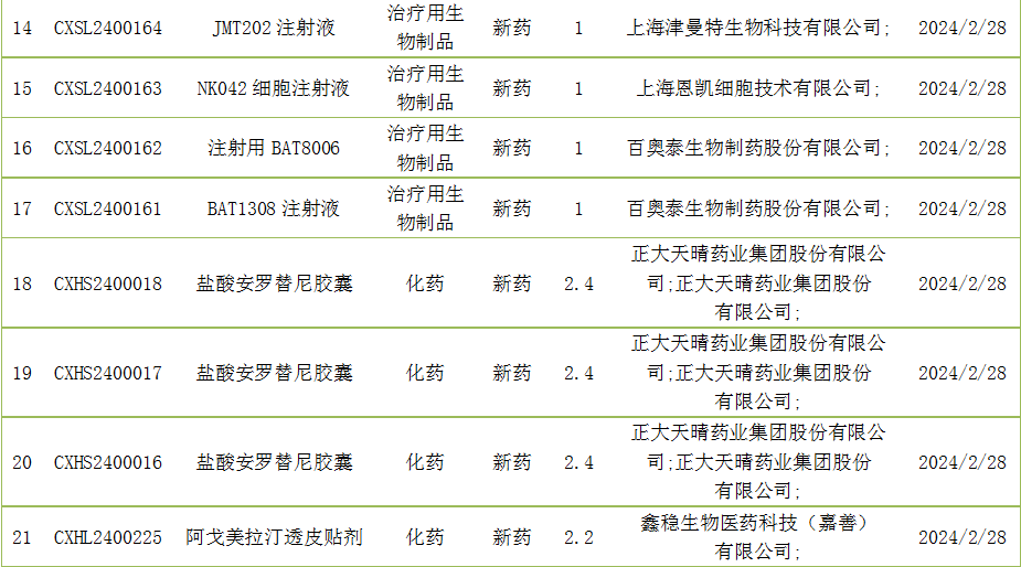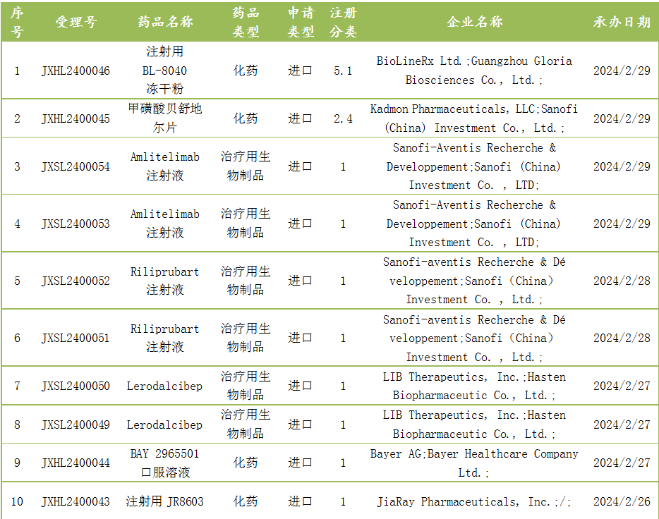 截至2月29日,CDE承办进口新药受理号14个,包括注射用BL-8040冻干粉等。