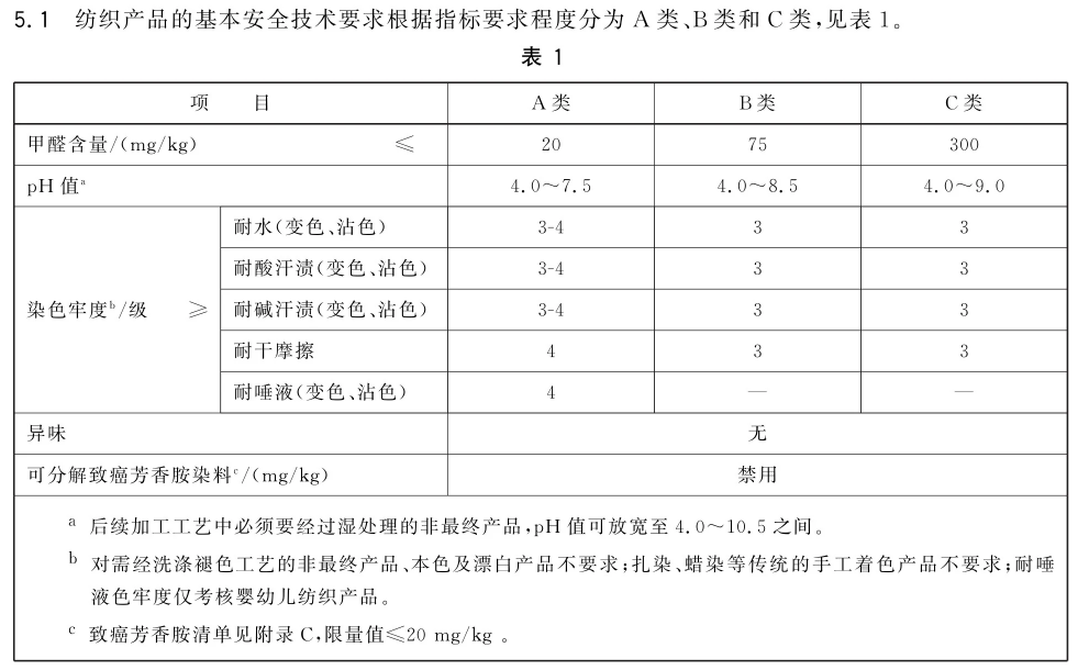 (婴幼儿纺织产品应符合A类要求,直接接触皮肤的产品至少应符合B类要求,非直接接触皮肤的产品至少应符合C类要求。)