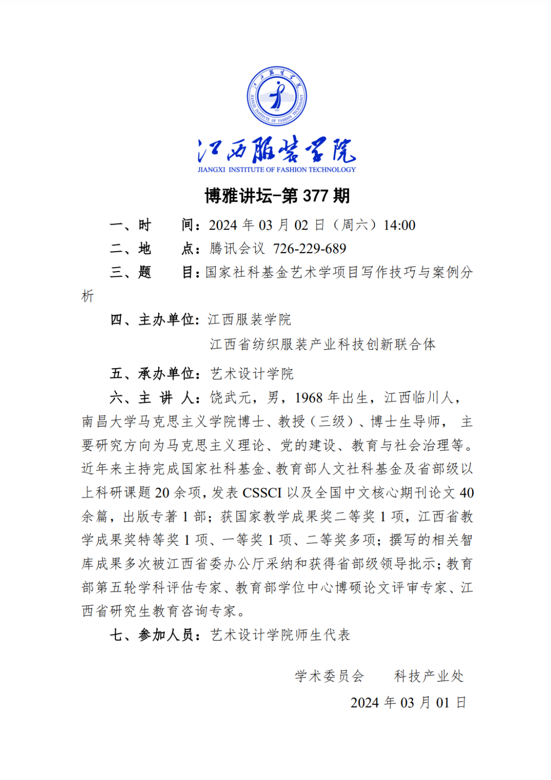 关于举办江西服装学院博雅讲坛(第377期)的通知