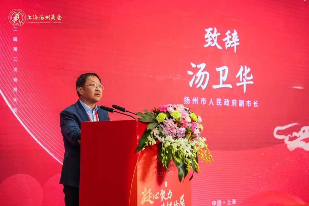 扬州市委常委、统战部部长丁四海,扬州市工商联主席戴凌云因公务不能到会,他们和家乡扬商代表一起通过视频方式为商会送上祝福。