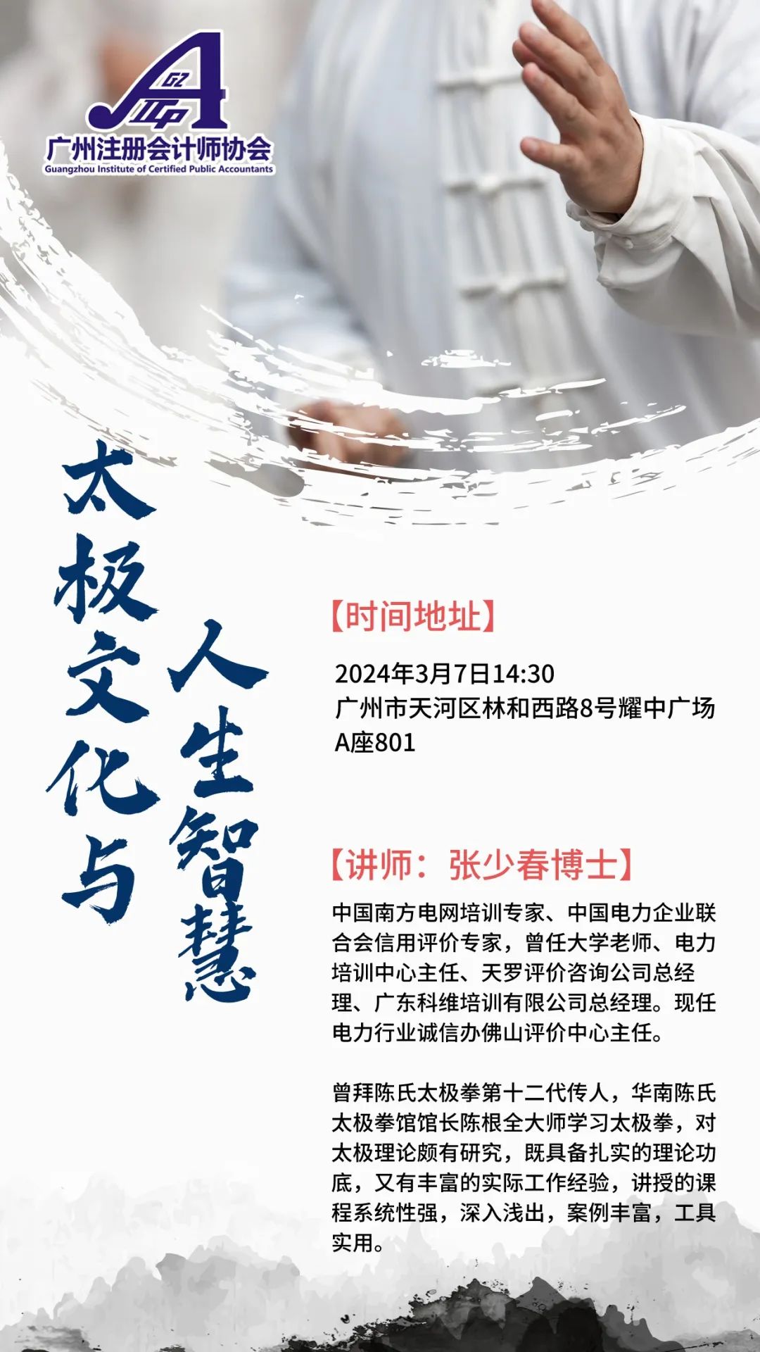 太极文化是中国传统文化中的瑰宝,蕴含着丰富的哲学内涵和生活智慧。三八妇女节将至,为了弘扬太极文化精髓,体验中华传统文化之美,广州市注册会计师行业工会联合会、行业团委共同举办“三八”节太极文化公益讲座,带领大家一同感受太极文化与人生智慧带来的启迪和力量。现将有关事宜通知如下: