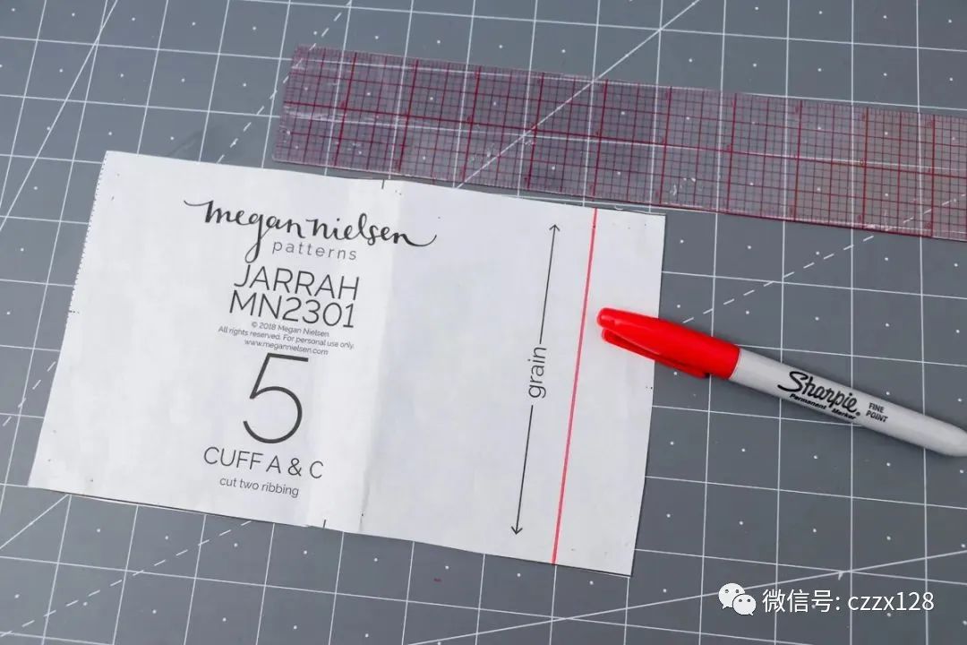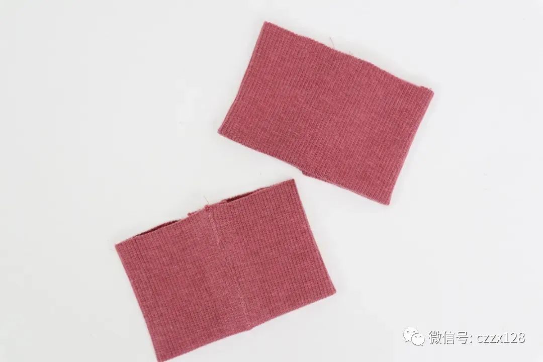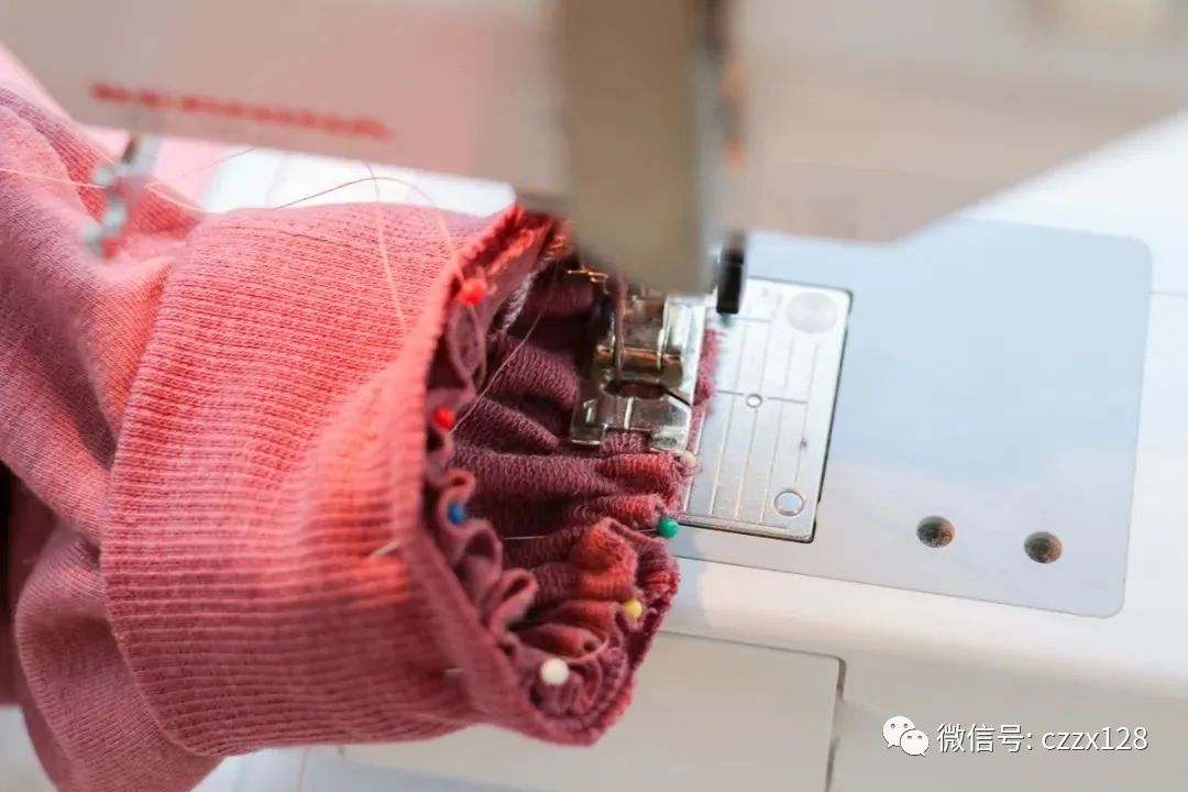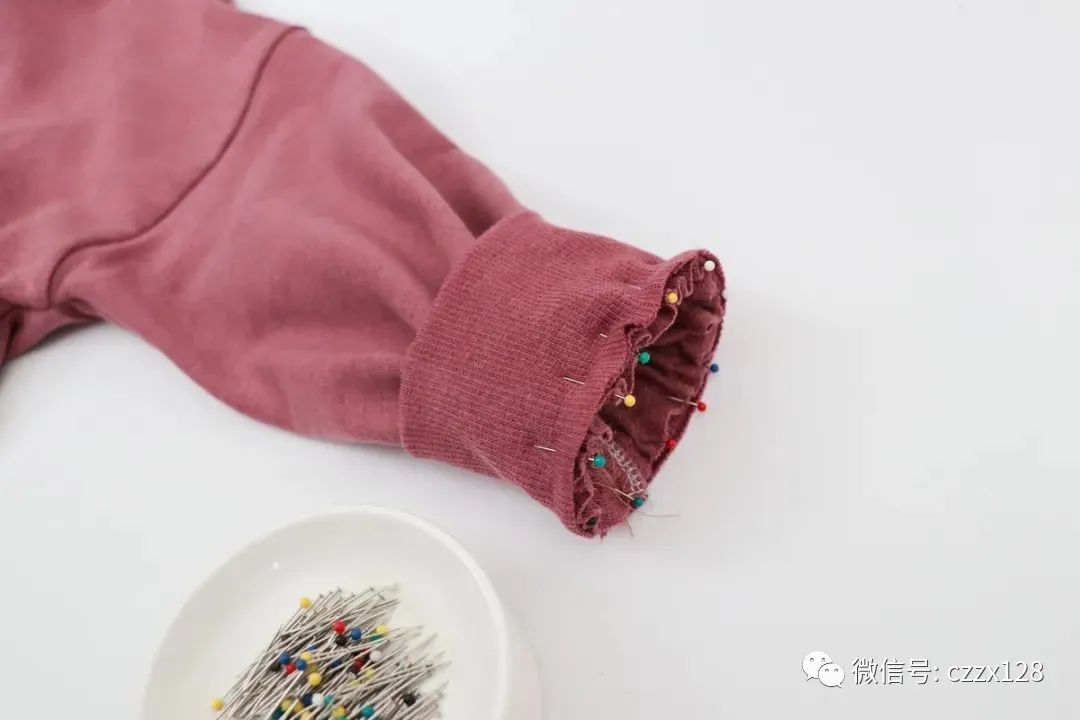 将罗纹袖口与收拢的袖口沿右侧对齐,用珠针固定在一起。