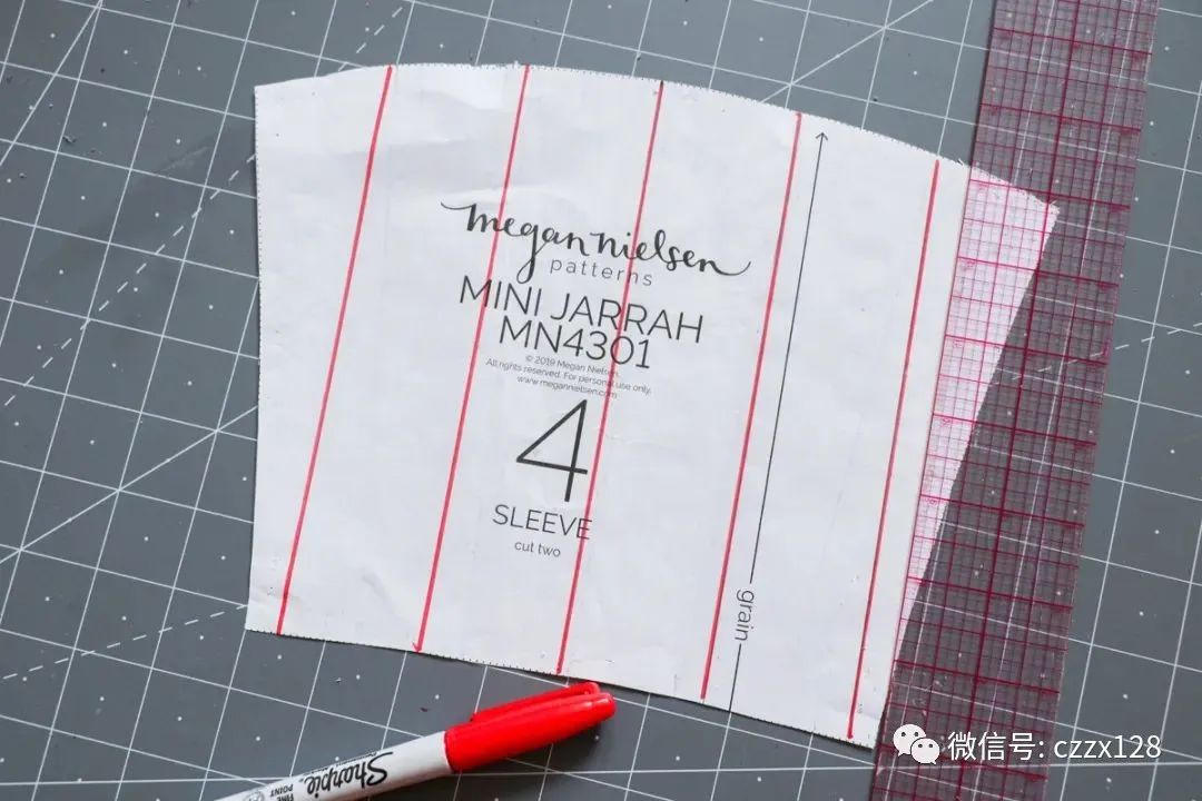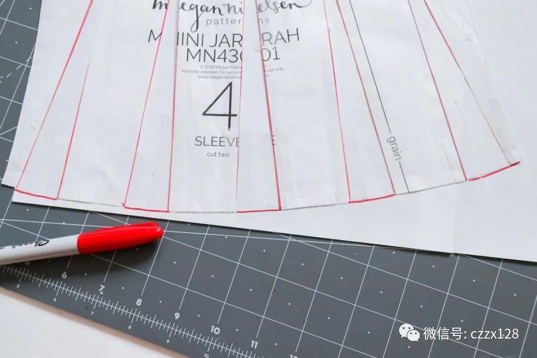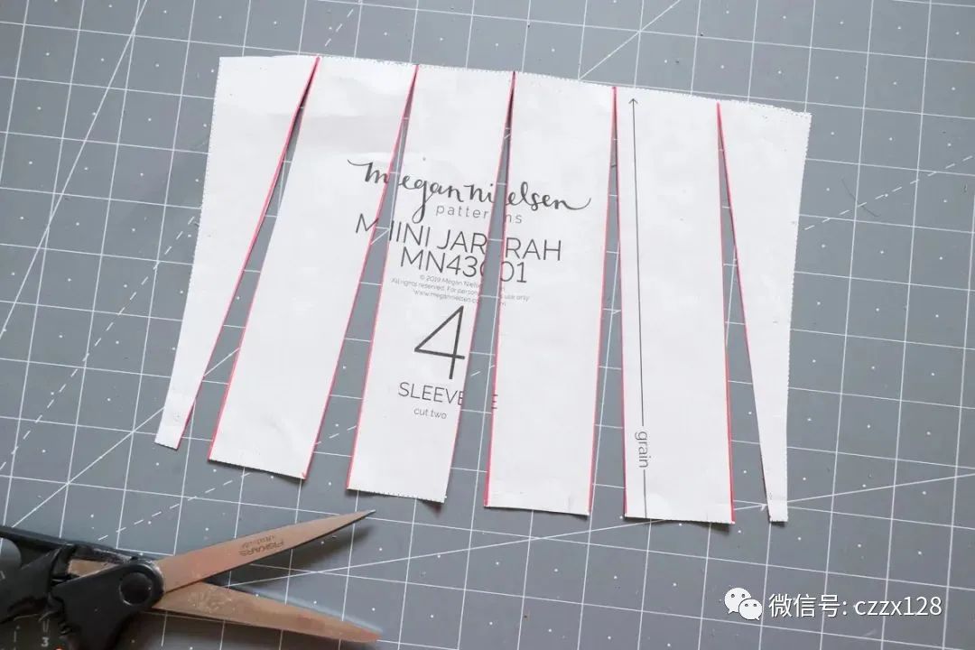使用锯齿形针迹,从原始边缘缝制1/4英寸。从内侧/褶皱袖子侧缝制起来更容易。