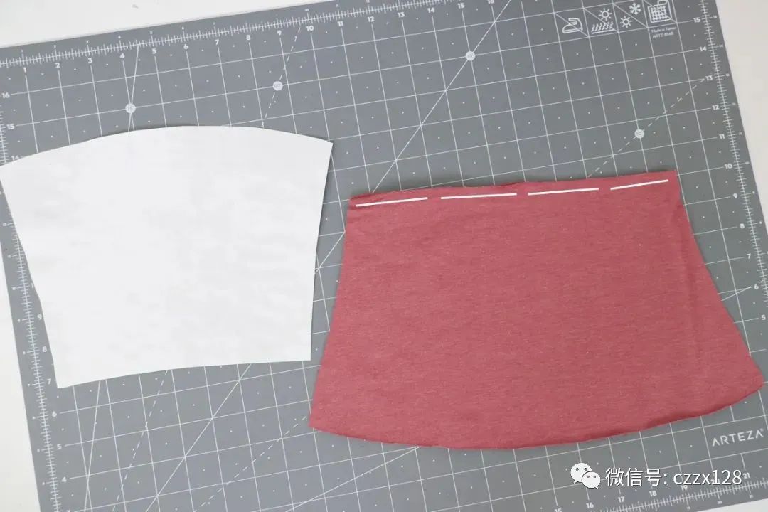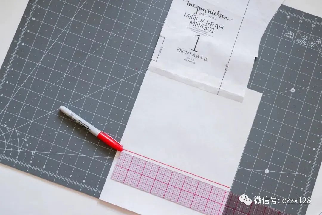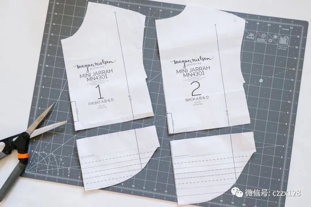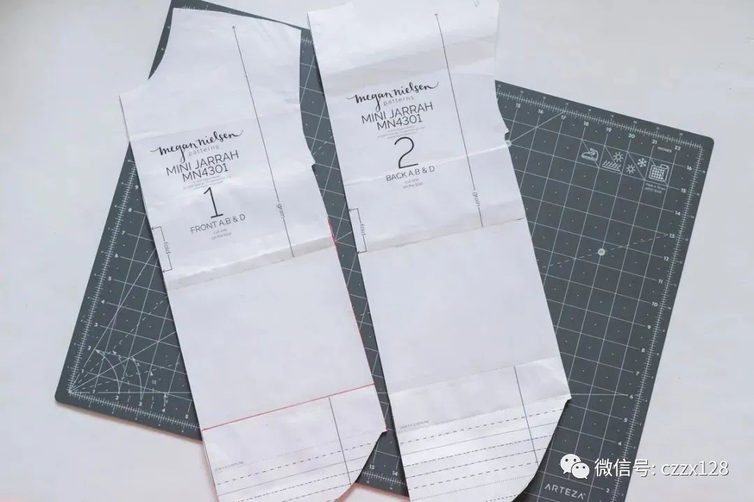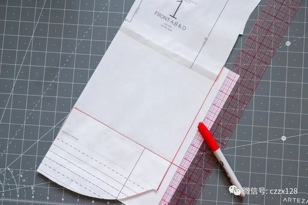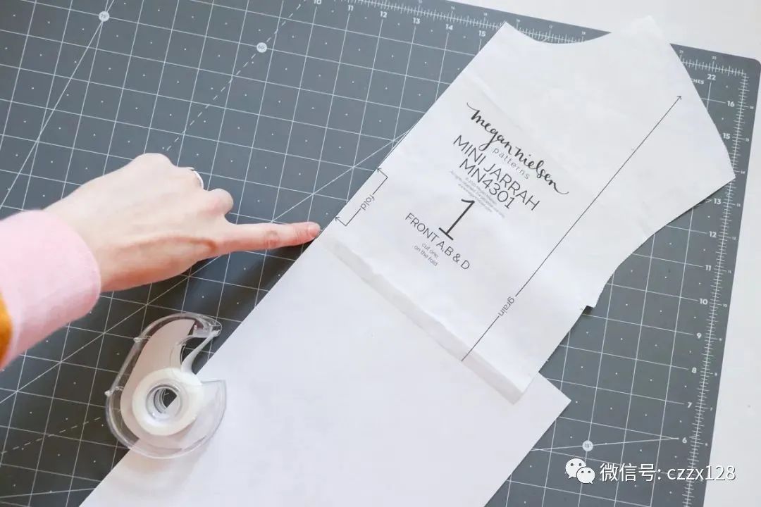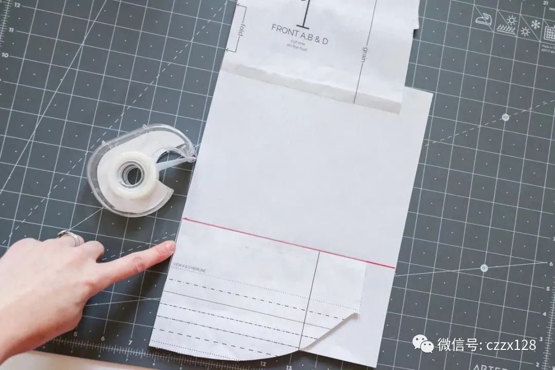 从前片开始,将上半部分粘贴到一张空白的纸上,以便中间的前边缘与纸的笔直边缘对齐,然后用胶带固定上万G服装教程威754093490。