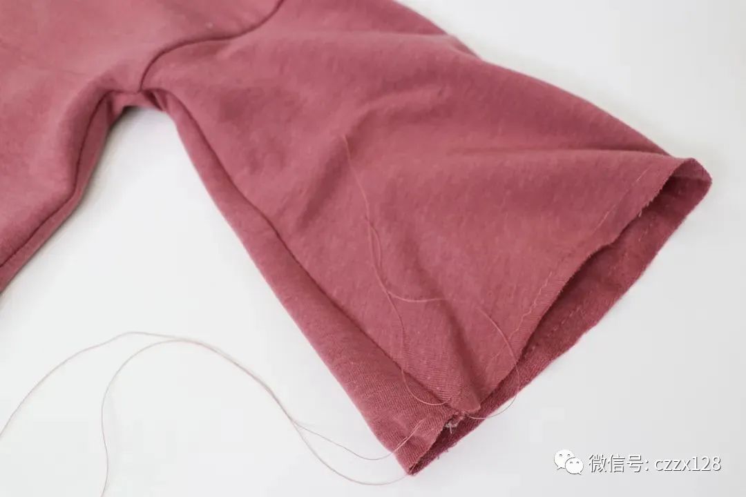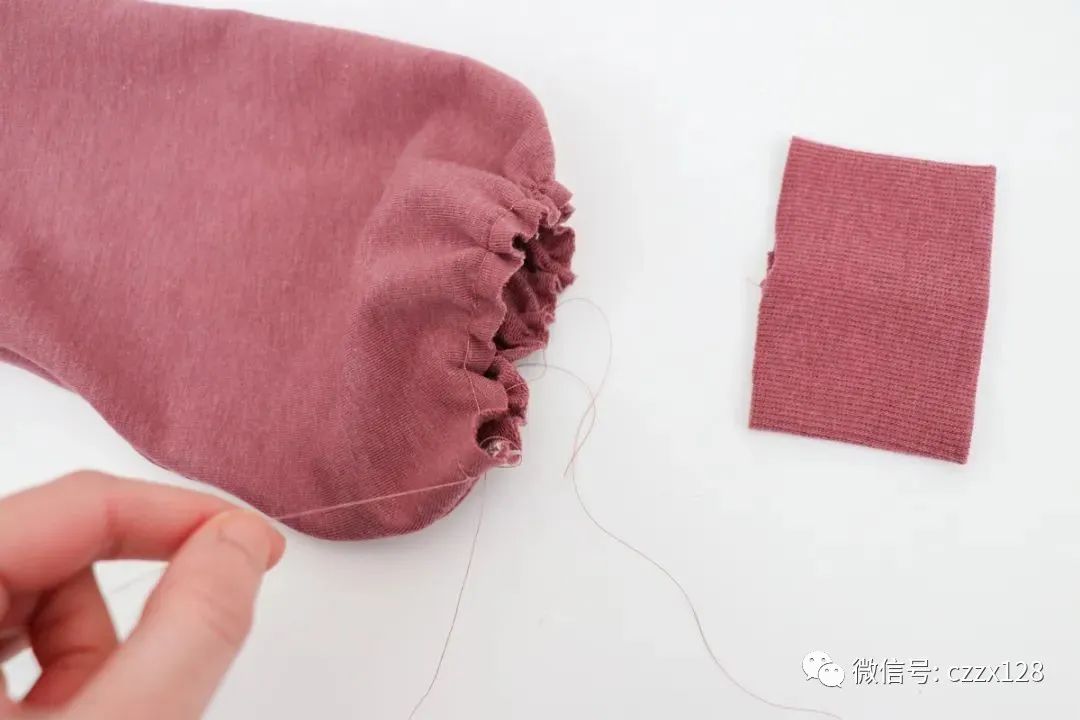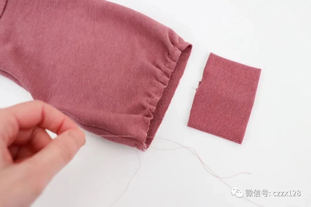 轻轻拉动线尾,以收起袖子的底部边缘,直到与袖口的宽度对齐为止。