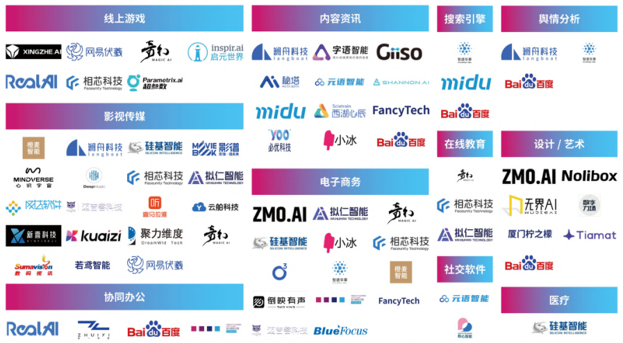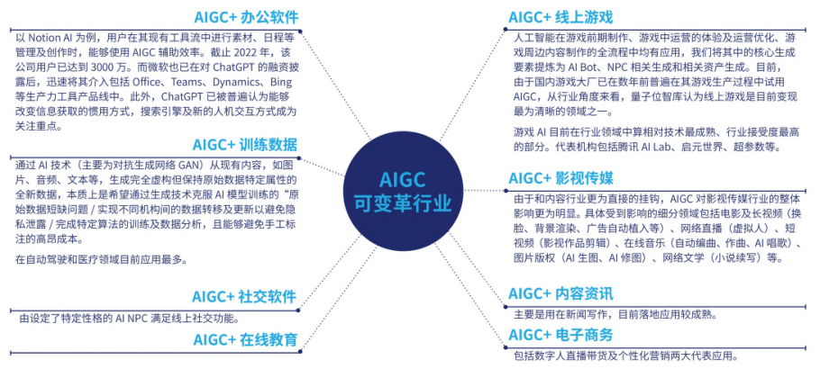 基于AIGC目前在全球的落地情况,结合其功能分析,我们将AIGC的可变革行业主要分为线上游戏、影视传媒、内容资讯、电子商务、办公软件、训练数据、社交软件、在线教育等