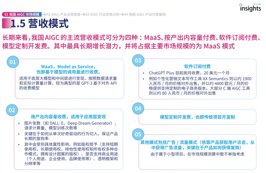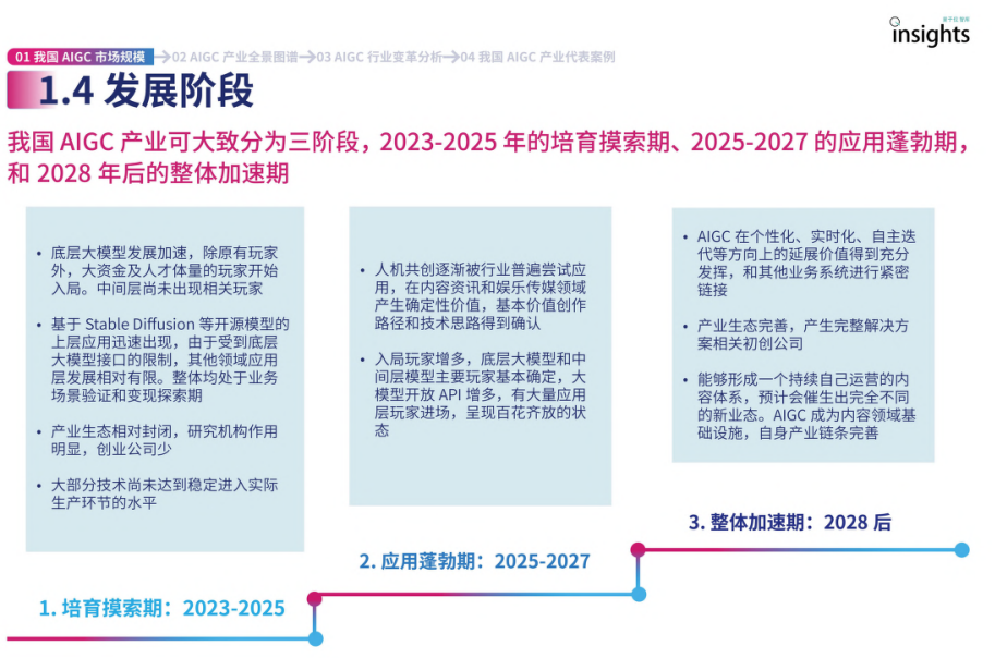 预计2027年我国AIGC产业规模超600亿人民币;2028年开始,AIGC产业将延展出完整产业链并在商业化场景上持续拓宽拓深,深入变革各行业