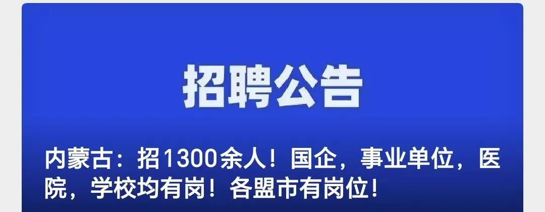 ➤点击查看:内蒙古:招1300余人!国企,事业单位,医院,学校均有岗!各盟市有岗位!