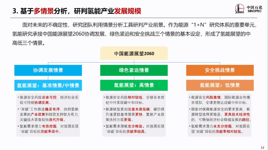 面对未来的不确定性,中国石化研究团队利用情景分析工具研判产业前景。作为能源“1+N”研究体系的重要单元氢能研究承接中国能源展望2060协调发展、绿色紧迫和安全挑战三个情景的基本设定,形成了氢能展望的中高低三个情景。
