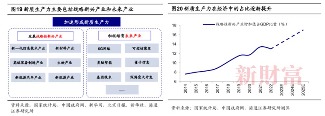 新质生产力与传统生产力有所不同,其摆脱了大量资源的投入,更加强调了科技创新与技术进步的主导作用,主要包括了战略性新兴产业和未来产业。