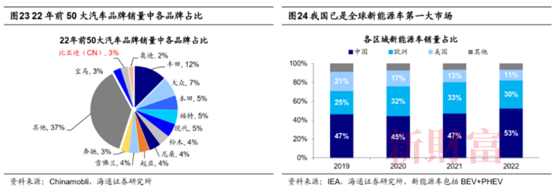 在国家政策支持与企业不断创新的推动下,我国新能源车产业快速成长。汽车产业是国民经济的重要支柱产业,在传统能源车时代中,我国整车、零部件企业的品牌力和竞争力都比较弱,而日本、德国等汽车强国在产业链中占据优势地位。而在汽车的电动化和智能化转型中,我国已经逐渐具备先发优势。2023年1-10月,我国新能源汽车销量同比增长37%,是世界最大的新能源车市场,产业链中动力电池、电机、电控等核心零部件领域已逐渐占据主导地位,根据ChemNet援引SNE research的数据,2023年1-10月,中国企业在动力电池市场份额超6成。汽车电动化、智能化浪潮中,我国整车企业开始崭露头角,根据汽车纵横网援引CleanTechnica,2023年1-9月,比亚迪在全球新能源乘用车市场中占据了20.9%的市场份额,超过特斯拉位列全球第一,广汽、理想、小鹏等国产品牌市场份额也逐年提升。