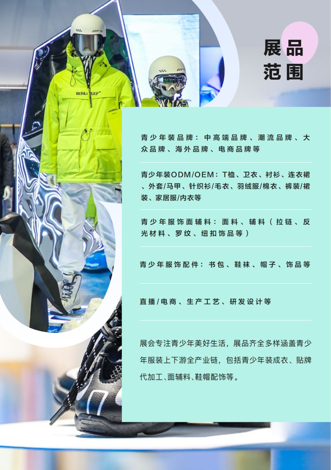 展会专注青少年美好生活,汇集2500+优质展商,展品齐全多样涵盖青少年装上下游全产业链,包括括青少年装成衣、贴牌 代加工、面辅料、鞋帽配饰等等。
