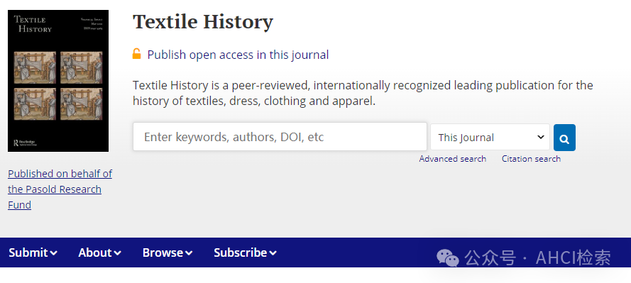 欢迎大家阅读本篇文章,感谢大家的支持和关注,今天我们分享的这本是A&HCI期刊:Textile History,这本刊的研究领域是历史,商业、管理和会计,工业与制造工程,我们一起来了解下这本刊的基本信息。出版社:ROUTLEDGE JOURNALS, TAYLOR & FRANCIS LTD出版社地址:2-4 PARK SQUARE, MILTON PARK, ABINGDON, ENGLAND, OXON, OX14 4RN出版商网址:http://www.tandfonline.com期刊官网:https://www.tandfonline.com/journals/ytex20《Textile History》是一本国际公认的同行评审期刊,也是该领域的领先出版物之一。它被视为当前研究的一个重要出口。它在每年的春季和秋季出版,其职责一直是促进出版高质量的研究和讨论,涉及纺织和服装史的各个方面的学术。创办以来,该期刊的范围已大幅扩大,包括涉及服装和纺织品的文化和社会历史方面的文章,以及历史纺织品或服装的展览、保护和解释所产生的问题。出版社:Taylor & Francis 提供一系列内容平台,将读者与知识联系起来。它们围绕客户需求而构建,旨在促进发现,并允许用户随时随地快速轻松地访问相关研究和信息。Taylor & Francis 是世界领先的学术出版商之一,也是最经久不衰的出版商之一。该出版社已经出版了超过145000种图书,2700多种期刊。America: History and LifeArtbibliographies Modern+Arts & Humanities Citation IndexBibliography of the History of ArtBritish and Irish Archaeological AbstractsCurrent Contents - Arts & HumanitiesDesign and Applied Art IndexEuropean Reference Index for the Humanities (ERIH PLUS)Getty Conservation Institute Project BibliographiesHumanities International CompleteInternational Bibliography of Periodicals Literature (IBZ)Modern Language Association BibliographyNorwegian Register of Scientific Journals and PublishersPublishing Opportunities DatabaseRoyal Historical Society BibliographyTextile Technology CompleteTextile Technology Digest2.编辑欢迎基于广泛学术视角的原创研究提交高质量的作品,包括经济、社会、艺术、设计和文化史,以及历史视角的物质文化研究。3.该刊仅发表英文稿件。请在稿件中始终使用英式拼写。4.一旦作者的论文被编辑评估为适合性,它将由独立的匿名专家审稿人进行双盲同行评审。6.论文可以Word格式提交。图表应与正文分开保存。7.稿件的所有作者都应在稿件的封面上注明其全名和单位。相关推荐