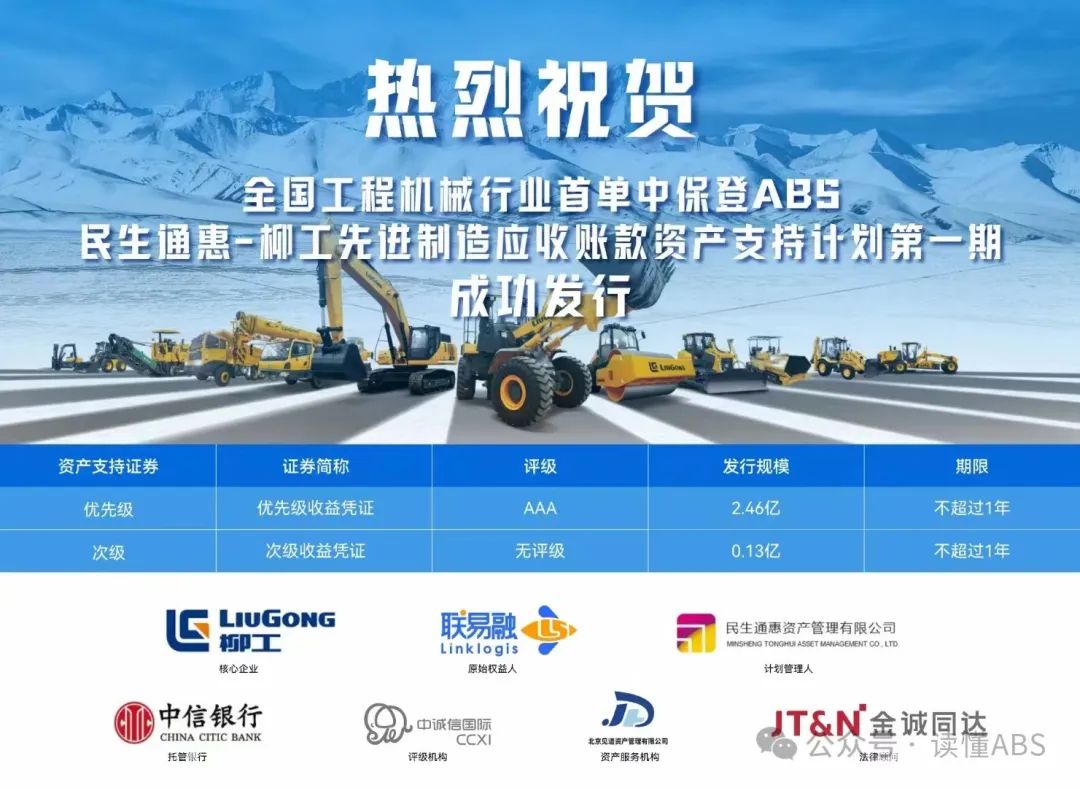 该证券底层资产为柳工下属两家主机厂柳州柳工挖掘机有限公司和柳工常州挖掘机有限公司基于经销协议项下对经销商享有的的应收账款债权及其附属担保权益;柳工担任项目流动性差额支付承诺人,深圳前海联易融商业保理有限公司担任原始权益人,民生通惠资产管理有限公司担任计划管理人,北京见道资产管理有限公司担任底层资产管理机构,中信银行南宁分行担任托管银行。本期证券的成功发行,实现了柳工主机厂对非直营经销商的应收账款出表融资,首次亮相中保登,提升了保险市场知名度,拓宽了柳工多元化融资渠道,实现了各方协同共赢,联手推进又一单工程机械金融创新产品。
