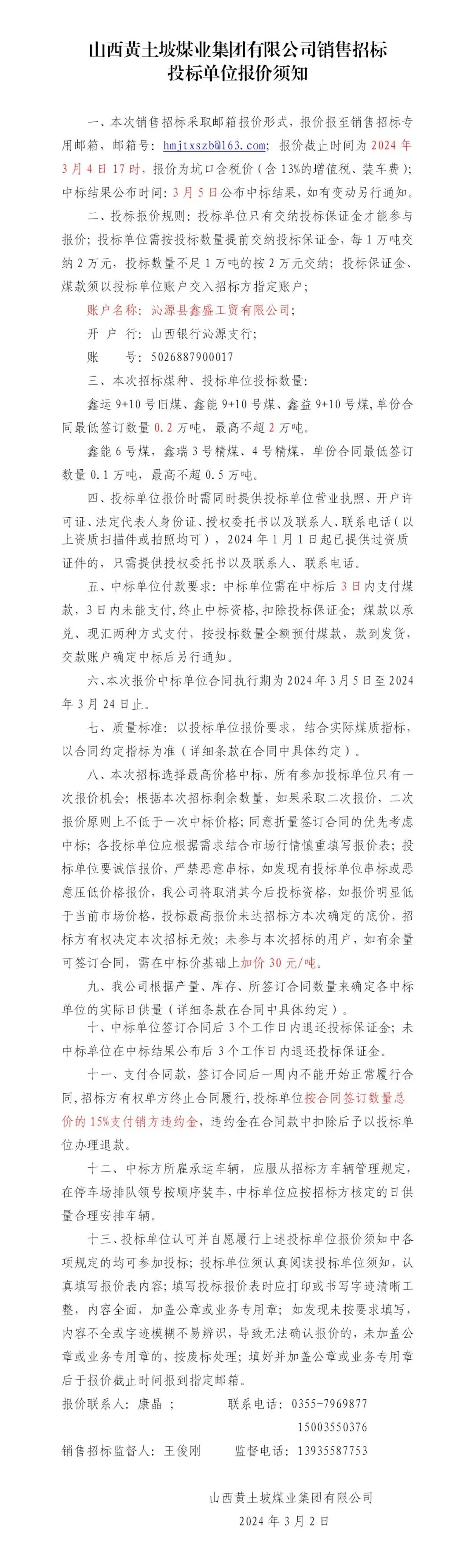 3月3日-3月4日黄土坡集团煤炭销售招标公告