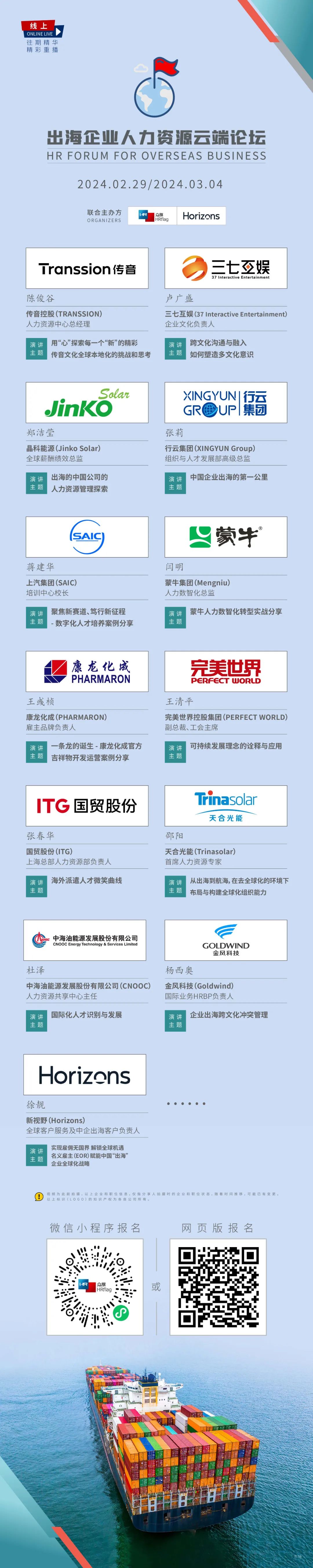 02月29日-03月04日,由中国领先的人力资源管理智库-HRflag全球领先的名义雇主服务商、人力资源科技SaaS公司-新视野数字科技公司(Horizons)联合主办出海企业人力资源云端论坛即将重磅开启!传音控股(TRANSSION)、三七互娱(37 Interactive Entertainment)、 晶科能源(Jinko Solar)、行云集团(XINGYUN Group)、上汽集团(SAIC)、蒙牛集团(Mengniu)、康龙化成(PHARMARON)、完美世界(PERFECT WORLD)、国贸股份(ITG)、天合光能(Trinasolar)、金风科技(Goldwind)等领先出海企业的人力资源高管和专家将围绕企业出海的热点话题,探讨人力资源管理的变革与挑战,为广大人力资源从业者带来全新启迪!