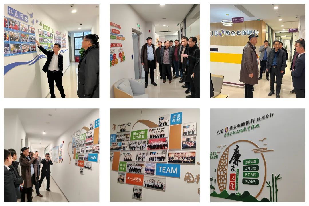 紫金农商银行扬州分行行长韦莹先向与会人员介绍紫金农商银行扬州分行的经营情况和业务范围,接着他热情地邀请商会一行参观党建阵地、清廉金融文化建设阵地及企业文化墙。在参观过程中,他详细介绍了银行的企业文化、价值观、使命和愿景等重要内容,让商会一行深刻感受到了银行的企业精神和团队凝聚力。蔡会长对银行的品牌建设大加赞赏,与会人员也都为紫金农商银行扬州分行的企业文化深深叹服。