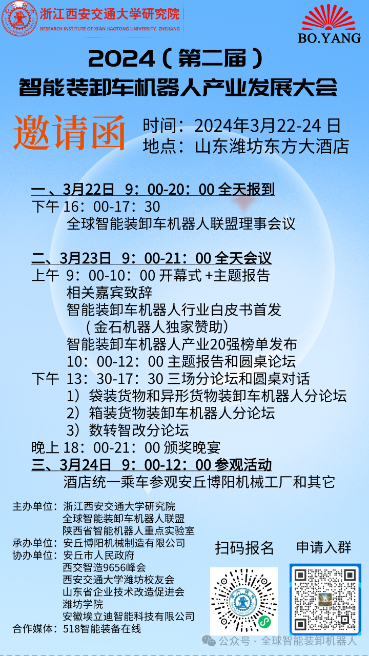 由浙江西安交通大学研究院、全球智能装卸车机器人联盟和陕西省智能机器人重点实验室联合主办,安丘博阳机械制造有限公司承办的2024(第二届)智能装卸机器人产业发展大会将于3月22-24日在山东潍坊举办!大会旨在解决用户如何选择合适供应商?设备研制企业如何定位自己产品?如何合作发展?一切围绕行业需求、解决问题为目的!