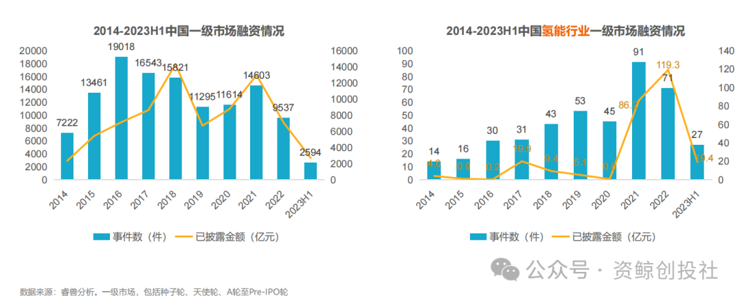 根据睿兽分析统计,截至2023年6月30日,国内氢能行业有240余家企业获得融资,涉及融资事件471件、融资金额284亿元,参与机构超过300家。2021年中国氢能行业一级市场融资事件数量91件,同比增长102.2%,融资金额86.2亿元,实现大幅度提升;2022年中国氢能行业融资事件71件,同比下降22.2%,融资金额119.3亿元,同比增长38.4%。