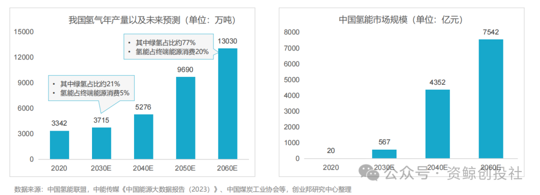 根据中国氢能联盟数据及预测,2020年,我国氢气产量为3342万吨,在2030年碳达峰愿景下,我国氢气的年需求预期达到3715万吨,在终端能源消费中占比约5%;在2060年碳中和愿景下,我国氢气的年需求量将增至1.3亿吨左右,在终端能源消费中占比约为20%,市场规模将达到7542亿元。