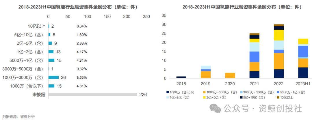 根据睿兽分析统计,2018-2023H1中国氢能行业融资金额在1000万~3000万元(含)的事件最多,占比8.33%,近五年1000万~3000万元(含)的融资事件数量占比均为当年最高。1000万-3000万元(含)占比在持续提升,2022年占比分别达到13.85%,较2018年(0%)提升13.85%,2023H1占比达到18.52%。国氢科技于2022年12月,获得45亿元B轮融资,由国家制造业转型升级基金、国家绿色发展基金等11家投资方,估值达到130亿元,成为目前氢能行业估值最高的独角兽企业。
