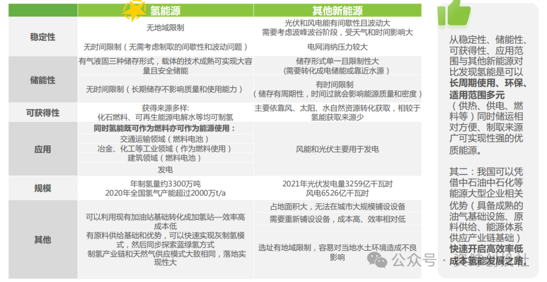 与其他新能源相比氢能的综合能力相对较优:可获取来源多且取用无时间天气限制、储能形式更多样化、应用范围更广既为燃料亦为能源、 规模体量大且现阶段落地可借鉴传统能源形式!