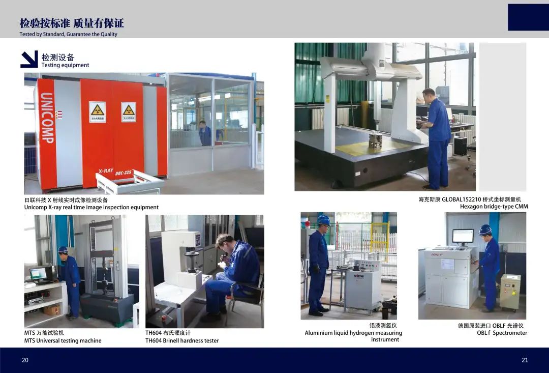 公司拥有高端的精密机械部件、航天、航空、动车、高铁、汽车零部件、军工机械部件的铸造和加工设备,并且引进了德国原装进口五轴五联动德马吉 DMU8OP 和DMU125P数控加工中心,奥地利EMCO HYPERTURN 690 九轴五联动加工中心,日本马扎克HCN8800-II卧式加工中心,拥有J455、J458 和J4510 型低压铸造机、600kg/h 铝合金熔化炉、Z8640 系列制芯机等精密铸造设备。公司还引进了海克斯康GLOBAL 152210 桥式坐标测量机,德国原装进口OBLF 直读光谱仪、日联科技X 射线实时成像检测设备,MTS万能试验机、超声波探伤仪等检测设备,为产品质量的稳定性提供了强有力的保障。