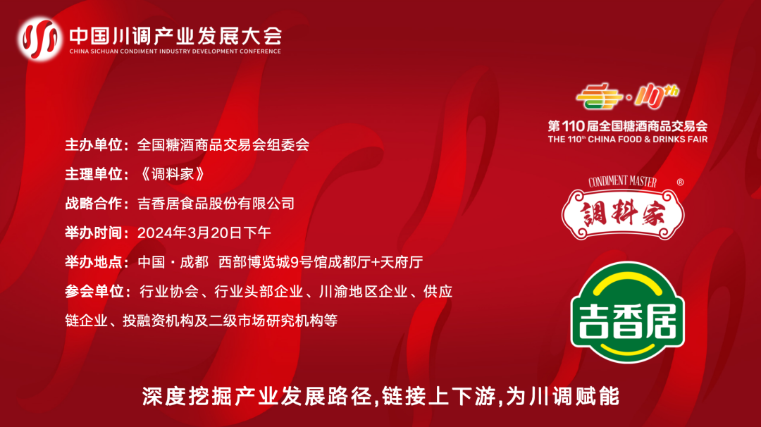 由全国糖酒商品交易会组委会主办,中国调味品主流媒体——调料家主理,吉香居食品股份有限公司战略支持的第四届中国川调产业发展大会将在第110届全国糖酒会期间于中国·成都隆重举行。
