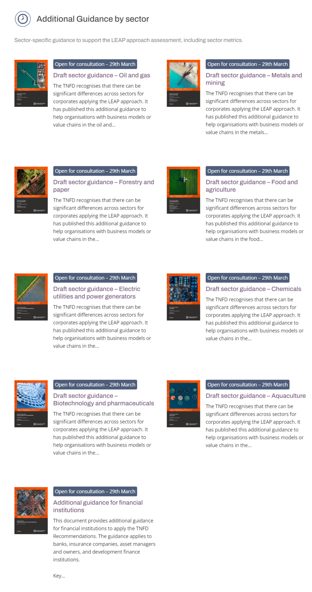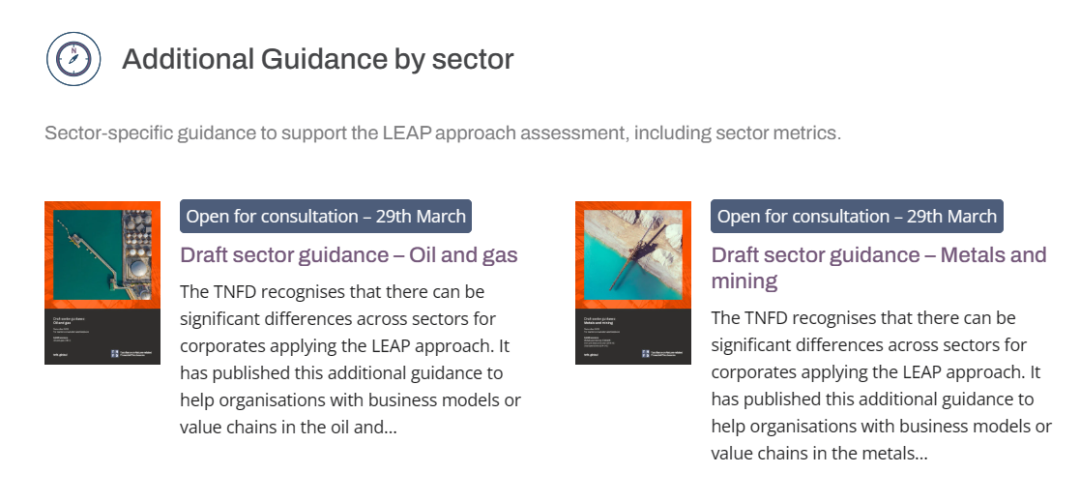 相对于GRI/ISSB/ESRS而言,TNFD在行业披露指引方面的速度比较快速,且已经在GRI 101生物多样性标准中说明可以参考TNFD及LEAP披露。