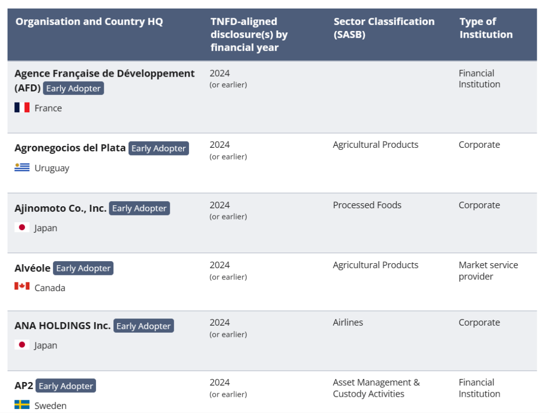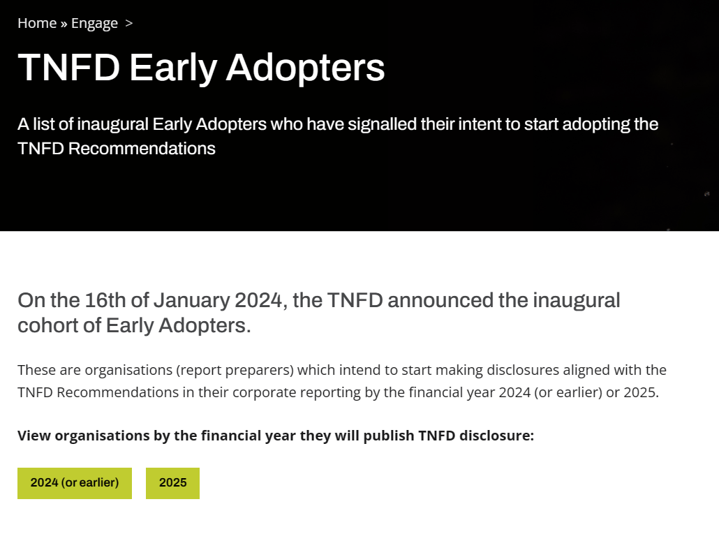 目前已经有相当多的公司接受该标准并计划自愿披露,参见(https://tnfd.global/engage/inaugural-tnfd-early-adopters/):