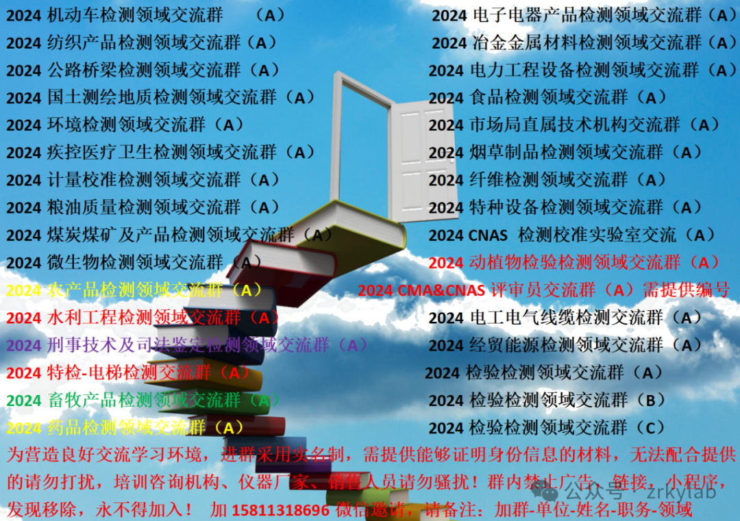 新建微信群,欢迎各位加入,为营造良好学习交流环境,针对检验检测行业领域做了划分,请各单位根据自身单位检测领域选择加入!只能进一个群,请勿重复要求进入其他群!多领域的可以进入,A B C 三个当中其中一个综合群。