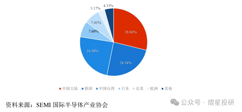 2021 年中国大陆和中国台湾半导体设备规模分别为296.2 亿美元和 249.4 亿美元,分别占全球市场的 28.86% 和 24.30%,中国大陆连续两年成为全球半导体设备第一大市场,2021年全球半导体设备市场份额如下图所示:
