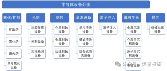 根据工艺流程,半导体设备主要分为制造设备和封测设备两类。其中,制造设备主要用于硅片制造和芯片制造环节,包括长晶炉、外延炉、光刻机、刻蚀机、