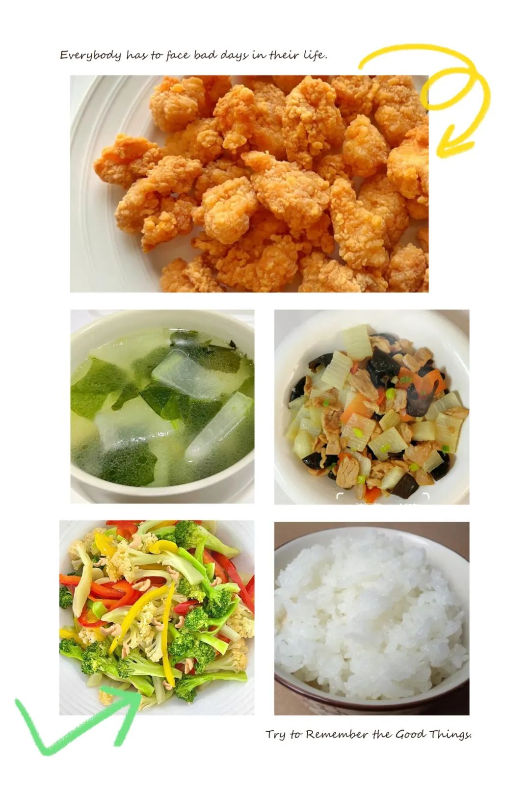 丰盛午餐:米饭 山药木耳炒肉 鸡米花 彩椒腰果炒双花 裙带菜冬瓜汤