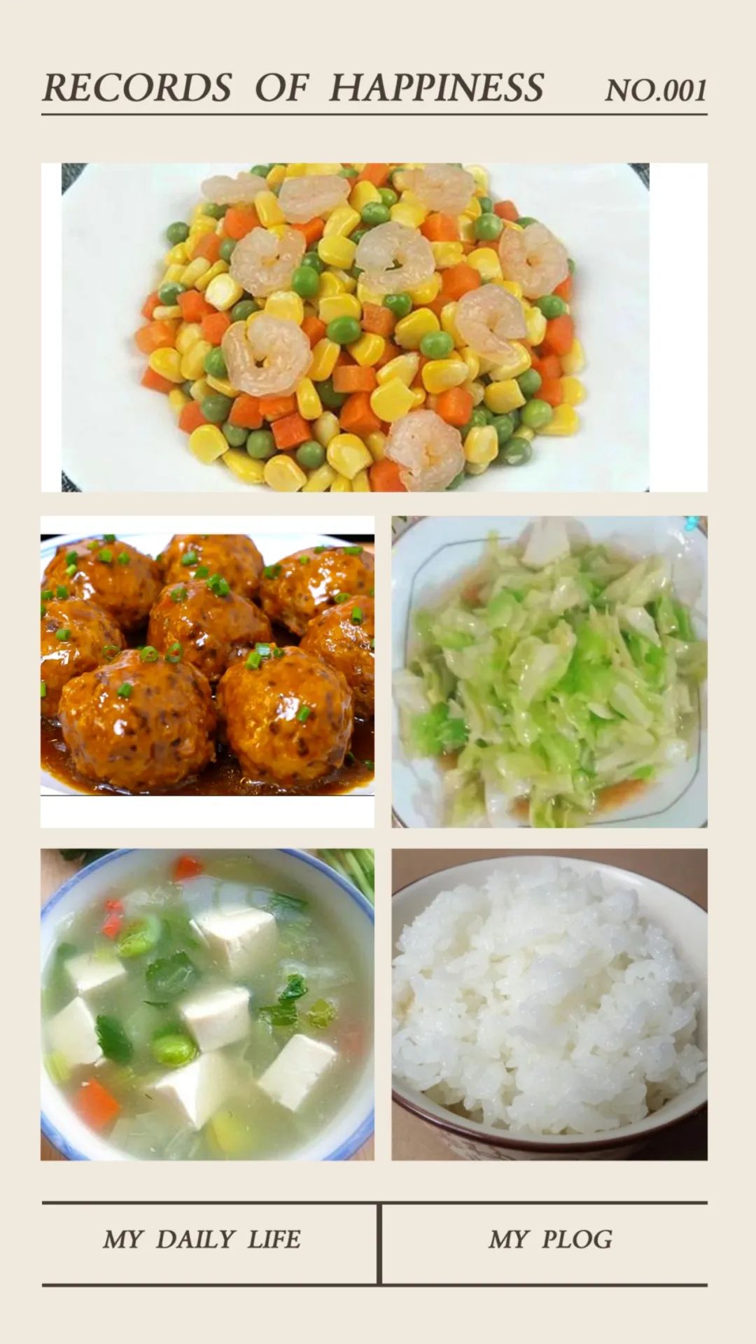 丰盛午餐:米饭 青豆玉米虾仁 红烧狮子头 手撕包菜 翡翠白玉汤