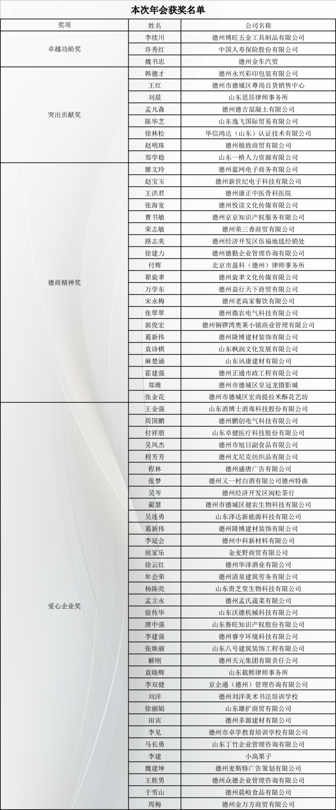 德商商会为爱心付出、热爱商会、无私奉献、和卓越担当的会员企业分别颁发了爱心企业奖、德商精神奖、突出贡献奖和卓越功勋奖,以鼓励他们为社会和商会做出的贡献。(获奖企业名单附后)
