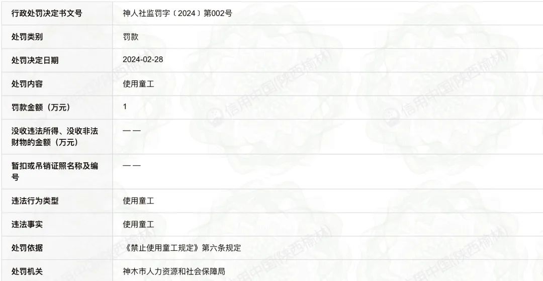 近日,信用中国(陕西榆林)公开的行政处罚信息显示,神木市晓青山餐饮服务有限公司因使用童工被罚1万元。