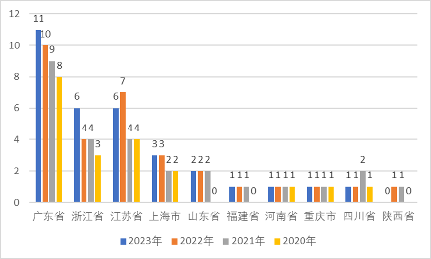 2023年我国共有32个千亿集群,比上年增加了1个,比2020年增加了12个,由此验证了2020年以来我国外贸的快速增长。2023年我国有9个省拥有千亿集群,比上年减少1个,退出的是陕西省集成电路行业。千亿集群数量的增多说明我国区域经济竞争力在不断增强,经济发展集聚状态更加明显。