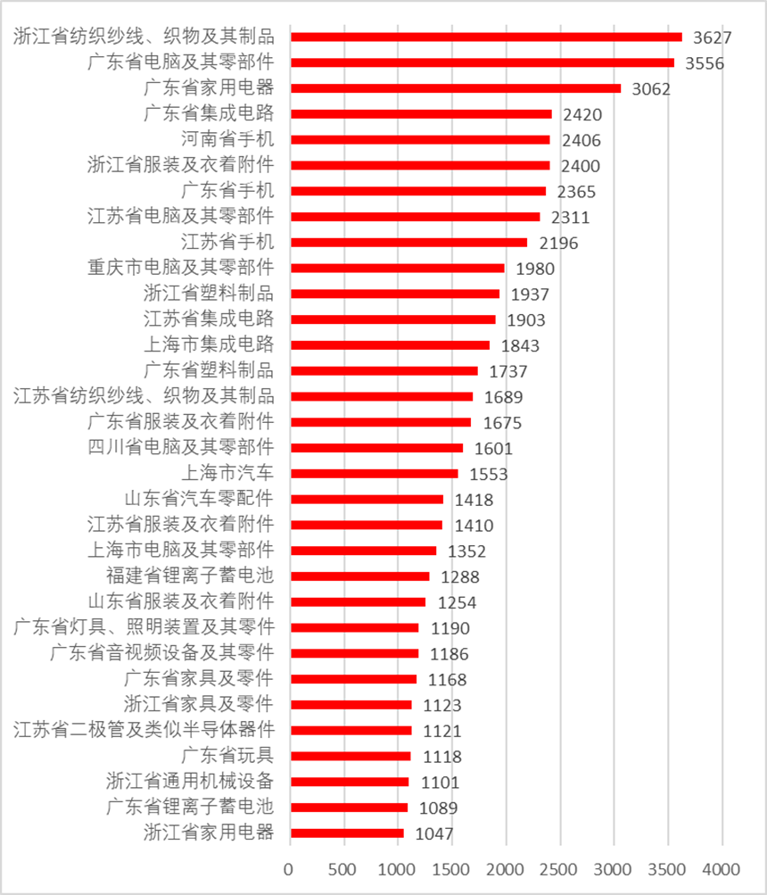 在32个千亿集群中,有3个超过3000亿元,6个在2000—3000亿元区间,23个1000—2000亿元区间,简要介绍前十大千亿出口产业集群情况。