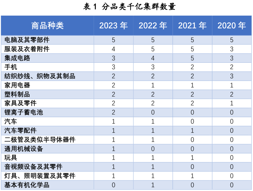 分省来看,广东千亿集群数量最多,共有11个,2020年以来每年增加1个,千亿集群总量接近全国的1/3;浙江和江苏的千亿集群同为6个,其中浙江比上年增加了2个,而江苏则减少1个;上海为3个,山东为2个,福建、河南、重庆和四川分别为1个,均与上年持平。总体来看,虽然中西部出口总量在增加,但是头部出口集群中的数量在下降,主要是受电脑和集成电路出口下降影响,近两年四川电脑和陕西集成电路出口规模均已不足千亿。