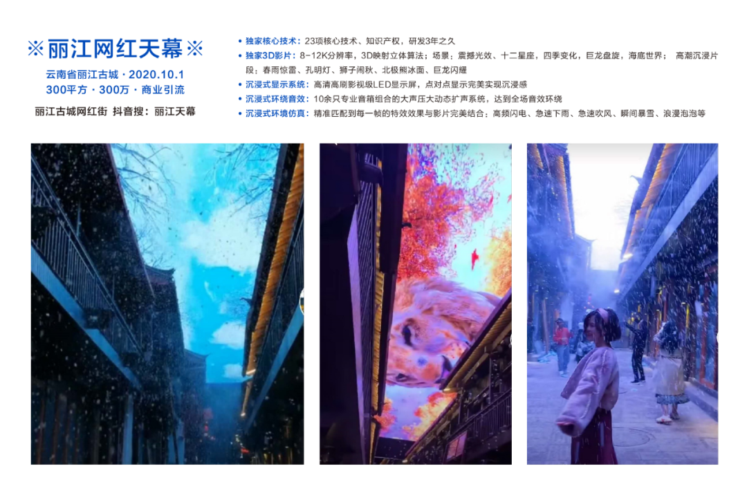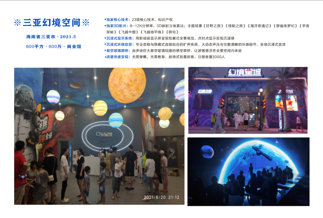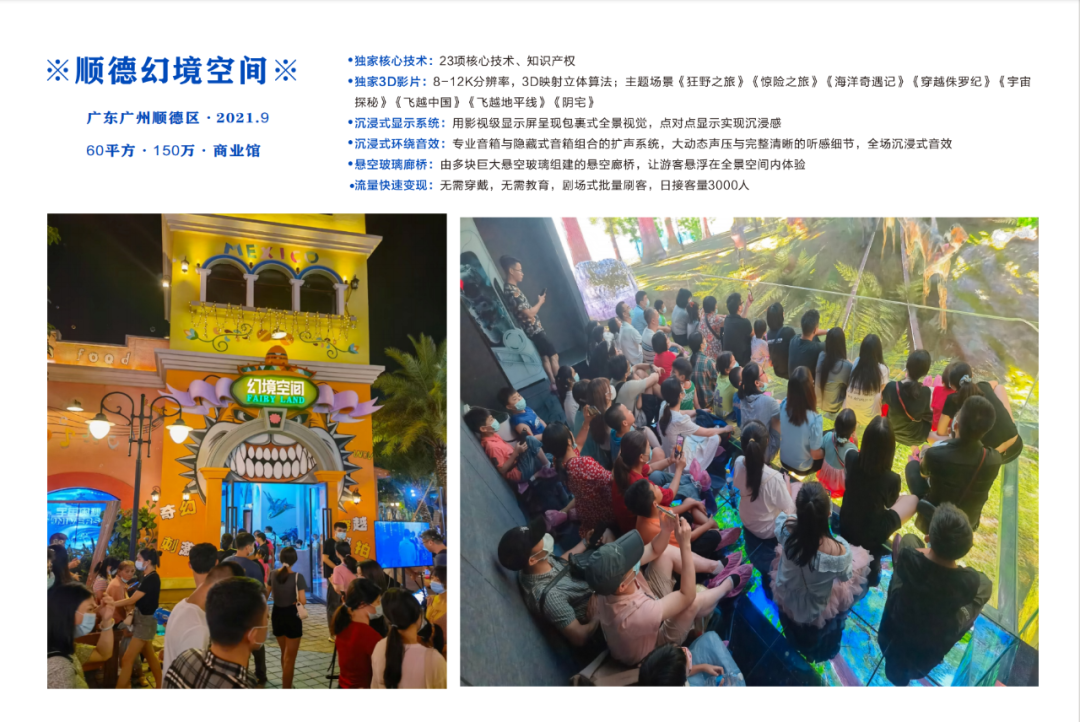 广州国威数字文化科技有限公司(以下简称:国威)是一家专注研发裸眼3D和主动式3D技术来建造数字主题乐园的高科技公司。国威经五年拼搏发展,陆续在苏州、广州、北京、河南、深圳、厦门建立了15家子公司,积累了80多件专利,150余项知识产权。其中沉浸式数字剧场《幻境空间元宇宙》已覆盖全国80%的市场。2018年,国威开发的沉浸式网红天幕产品,火边了丽江、昆山、三亚等地(抖音搜:昆山网红天幕)。2019年,国威开发的幻境空间悬空玻璃剧场(抖音搜:幻境空间),一经推出,遍迅速的火遍大江南北,开设一家门店火爆一座城市,新开门店经网络预售即可获得几十甚至上百万的预售,为商业投资客户带了稳定的收益。并持续在多地霸占抖音榜单。2020年,国威中标了冬奥会的接待场馆建设,并承接了冬奥会的宣传内容研发,冬奥会举办期间,得到各国游客好评。2021年,国威在承接三亚幻境星城项目,打造了三亚必打卡之文旅项目;2022年,国威在北京、广州、合肥、长沙、青岛、郑州建设了样板旗舰店,辐射全国市场;2023年,一年内新开90家门店,幻境空间品牌荣获抖音生活服务综合行业“年度新风向品牌”奖和荣获万达“最佳创新奖”,国威公司荣获“高新技术企业”和“科技型中小型企业”。爆红网络的幻境空间悬空玻璃剧场是基于VR技术,把全景沉浸式影片通过映射畸变算法点对点的在5面或6面裸眼3D主动光LED屏幕上显示出来,画面清晰、艳丽且逼真。可瞬间切换场景,用小空间模拟大空间,甚至是无限空间,变幻出真实环境、真实时间、真实速度或者真实维度体验不到的场景。观众在体验时可以不用穿戴任何道具,通过裸眼3D视觉,高清晰度沉浸式音效,舒适的光影效果和网红抖拍互动,让观众有一种跨越时空、穿梭天地的体验感。不但在现场得到极致的沉浸体验,拍摄出来的视频也是如同穿越到各个虚拟场景中,目前是短视频的内容时代,随手一发即可吸引了众多粉丝围观,造成传播以及裂变的效果。到目前为止,已陆续在全国直营和加盟 156余家 幻境空间超级元宇宙项目,在抖音曝光 6.8亿次。国威持续推动幻境生态的发展,优化供应链,吸纳优秀人才推动运营带店服务,开发衍生产品,各种商业模式的尝试和实验,来稳定幻境数字主题乐园生态的推进。在高速发展的同时,持续打造样板门店,以及建设加盟店,同时继续大力投入技术研发,打造幻境数字主题乐园,不断丰富科技体验类产品,为文旅、商业赋能。上海千古情幻境空间、西安千古情幻境空间、杭州千古情幻境空间贵州“中国天眼”(FAST)幻境空间、佛山顺德华侨城幻境空间、海南海昌不夜城喷泉广场幻境星城